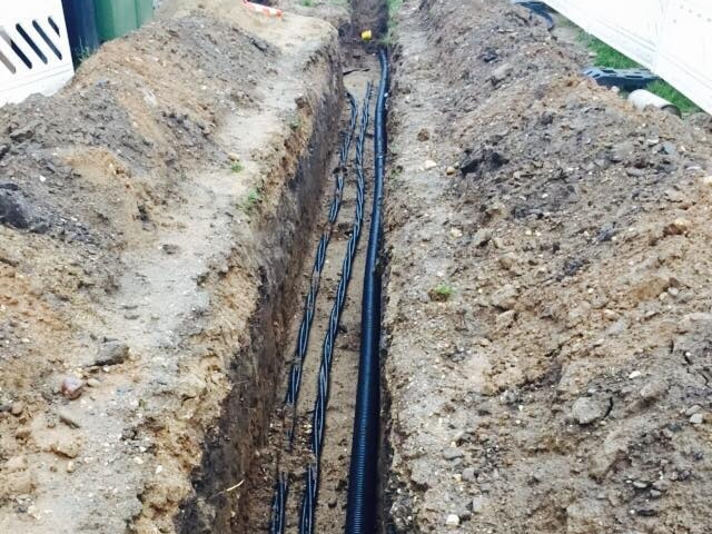 Im Rahmen der Energiewende und Digitalisierung sorgen wir für die sichere Verlegung von Strom- und Telekommunikationskabeln, mit oder ohne Schutzrohre. Effizient, dokumentiert und abgestimmt auf Netzbetreiber-Vorgaben.
